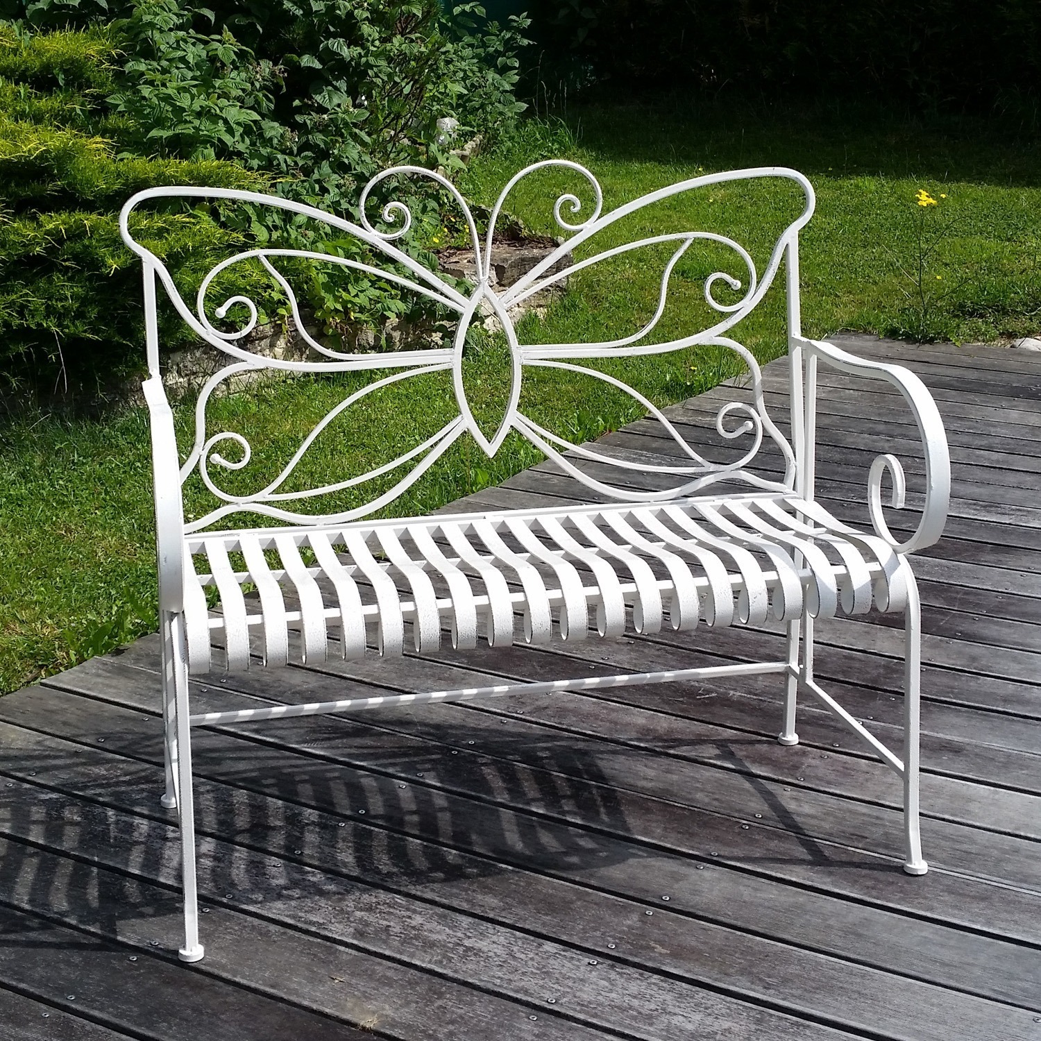 Banc en fer forgé de jardin blanc d’une longueur de 105 cm.