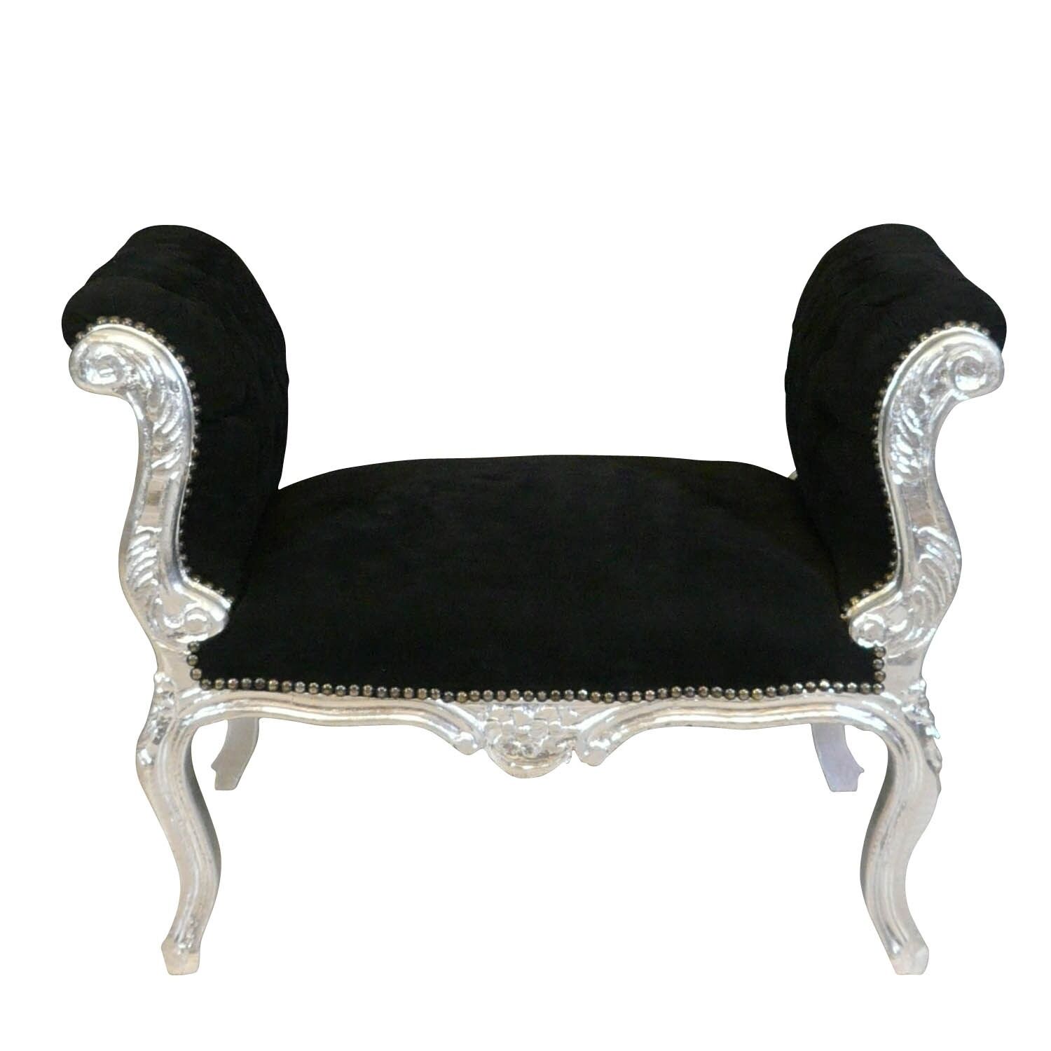 Banquette baroque en velours noir et bois massaf de hêtre argenté, son assise très confortable en fait un siège complémentaire à votre ensemble de salon.