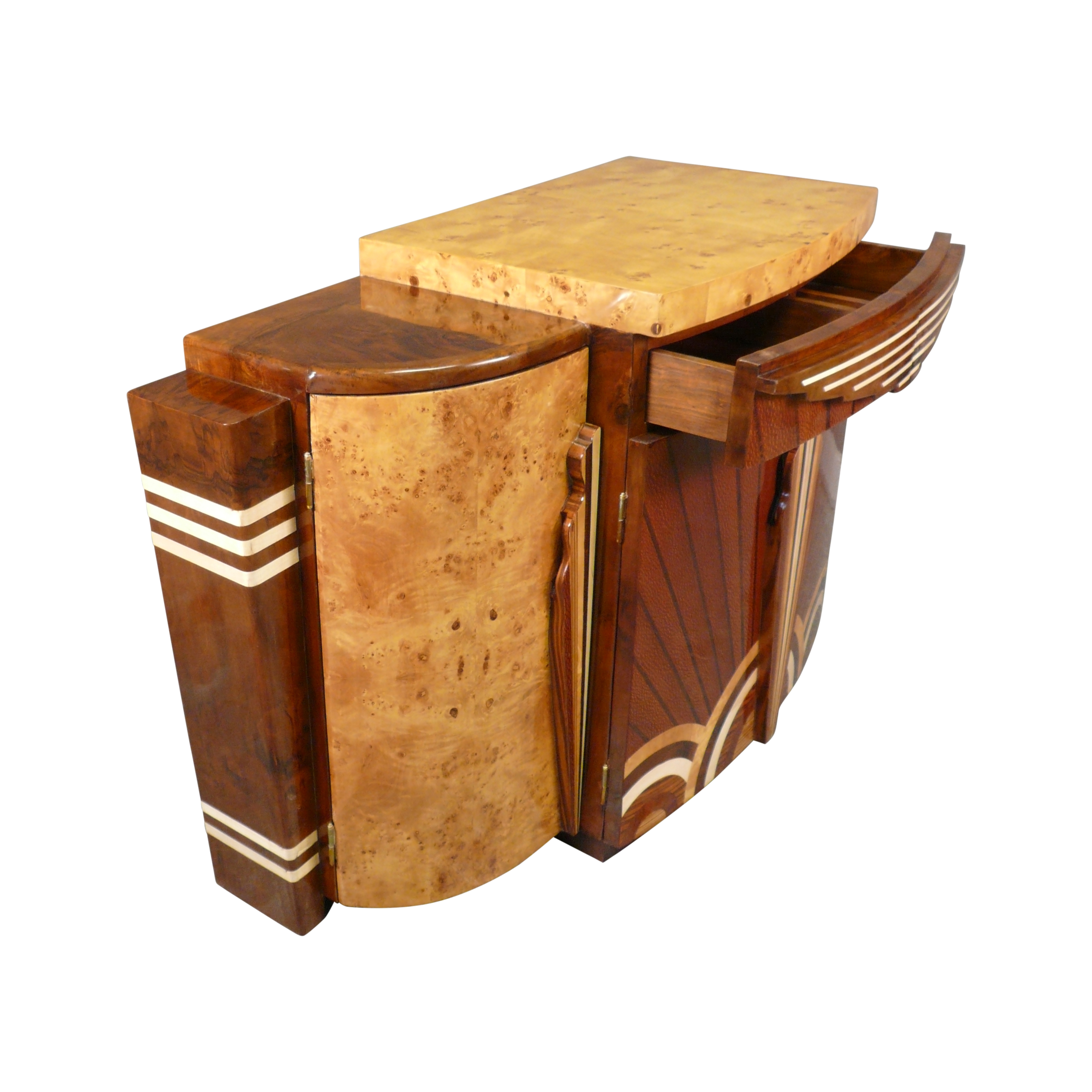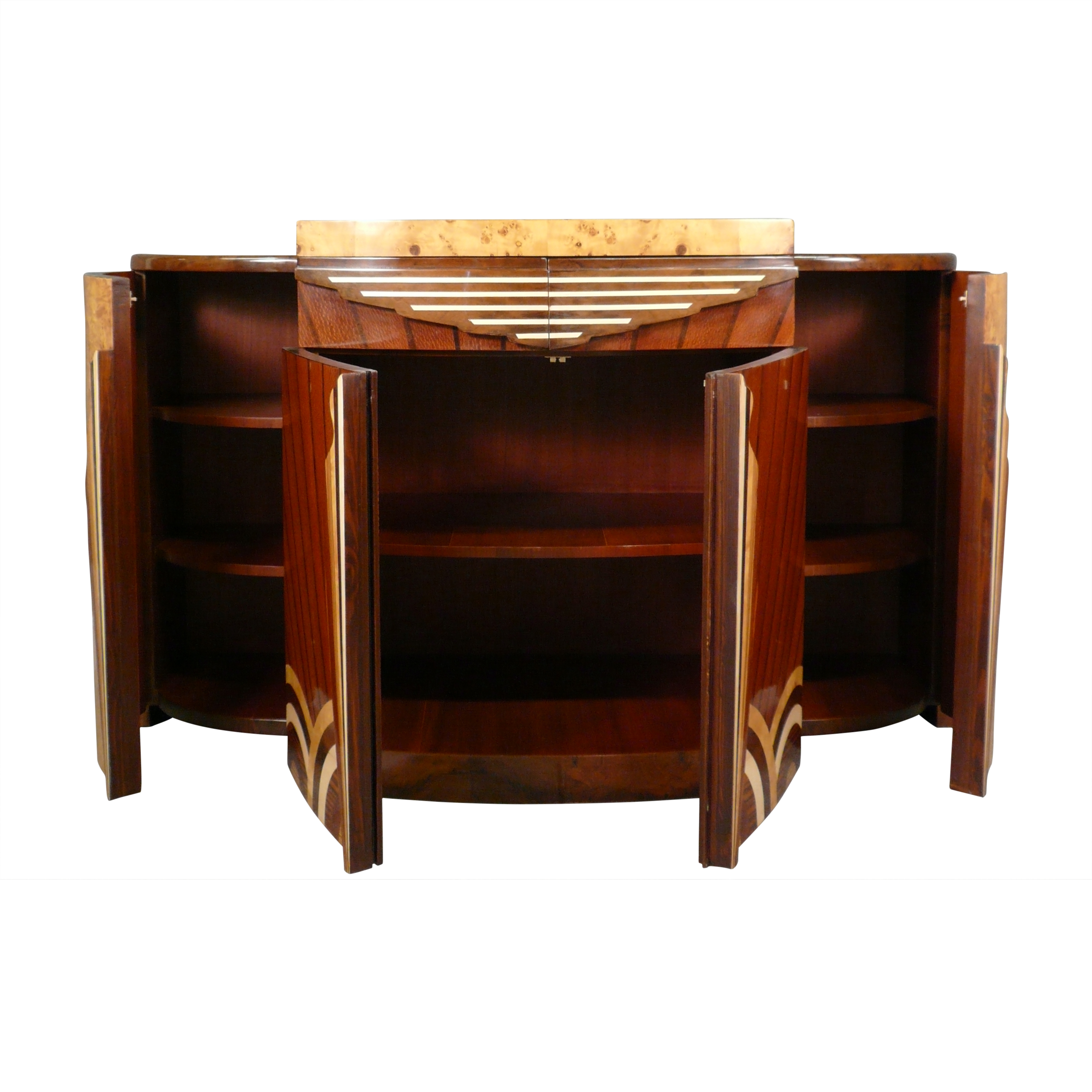 Chaque détail de ce buffet art déco reflète la sophistication de l’époque. Il a été conçu à partir d’une marqueterie de bois précieux, présentant un mélange de loupe d’orme, d’acajou d’Asie moucheté, de palissandre, et de noyer d’Amérique, le tout monté sur un solide cadre en bois de hêtre.