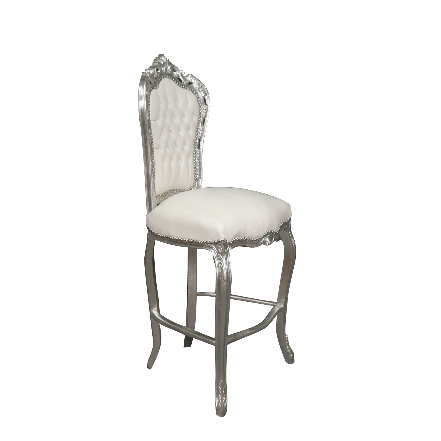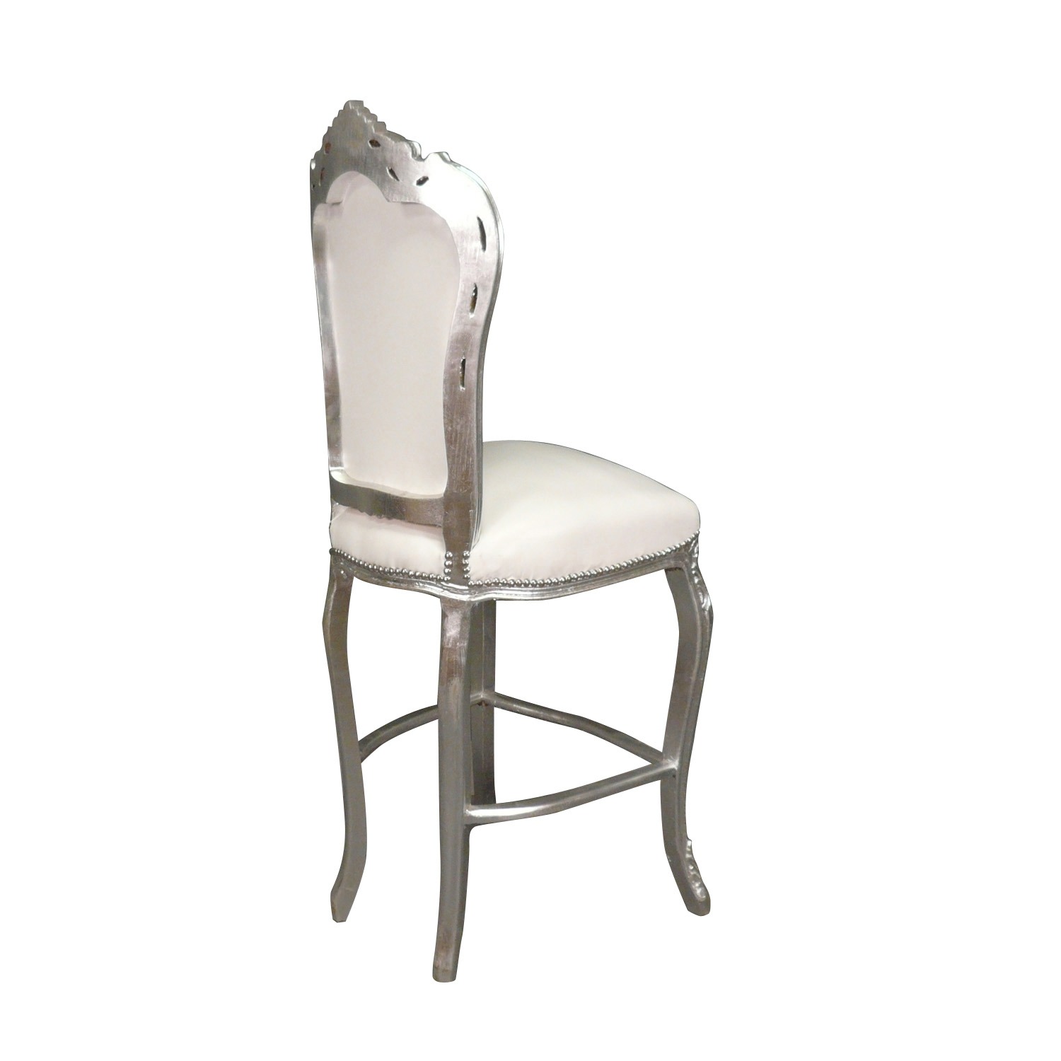 Cette chaise baroque de bar blanche style Louis XV est spécialement conçue avec un cadre en bois massif pour pouvoir résister au temps et offrir cet aspect chaleureux. Celui-ci est sculpté à la main et adopte un assemblage traditionnel qui fait de lui un siège très stable. Son assise présente une excellente résilience. Son tissu d’un blanc immaculé fera tourner les têtes. Celui-ci est fixé par des clous de tapissier.