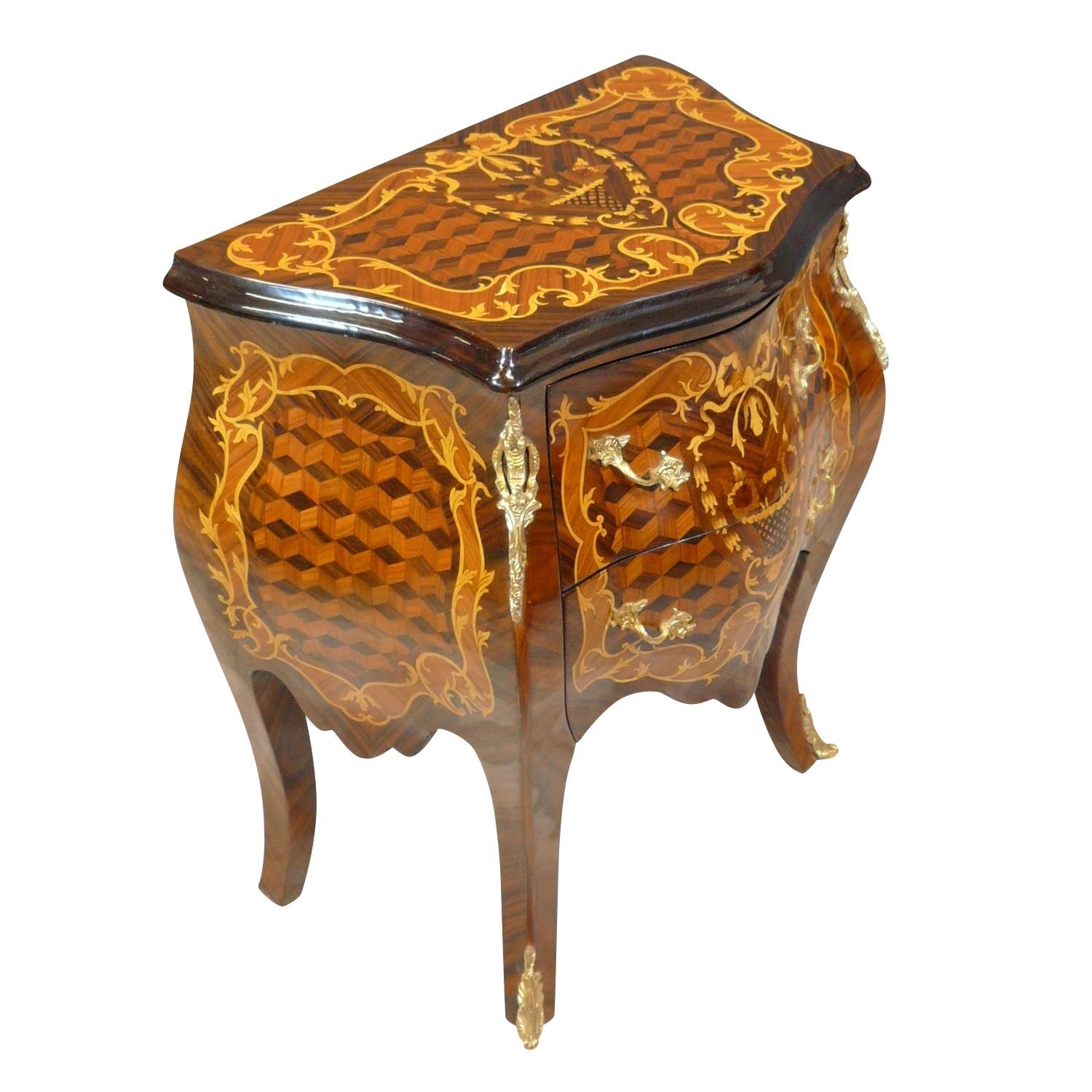 La structure est réalisée en bois de hêtre, gage de solidité, et recouverte d’une marqueterie composée d’acajou, d’acajou blond, d’amarante et de bois de violette. Chaque essence a été soigneusement sélectionnée pour ses teintes chaudes et son veinage élégant. La façade et les côtés galbés s’ouvrent par deux tiroirs, montés à l’ancienne, et ornés de bronzes ciselés dorés. Le vernis, appliqué à la main selon la méthode traditionnelle du tampon, révèle toute la profondeur du bois et protège durablement la surface.