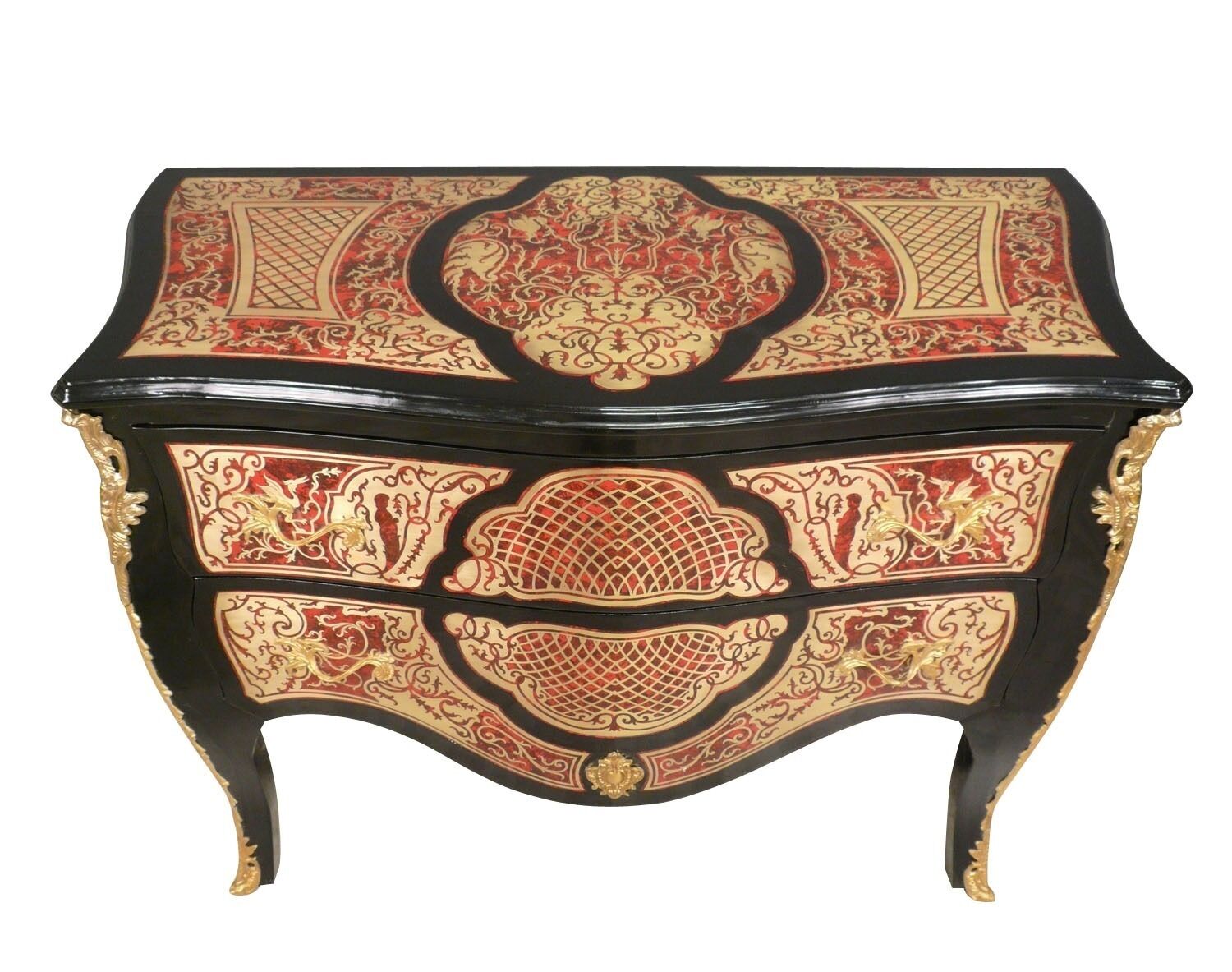 Sublimez votre intérieur avec cette commode Louis XV en marqueterie Boulle, une pièce d’exception inspirée des créations luxueuses du célèbre ébéniste André-Charles Boulle. Son laquage noir profond met en valeur ses somptueux bronzes dorés, tandis que sa marqueterie, composée de laiton, cuivre et matières synthétiques imitant l’écaille de tortue, lui confère un cachet unique.