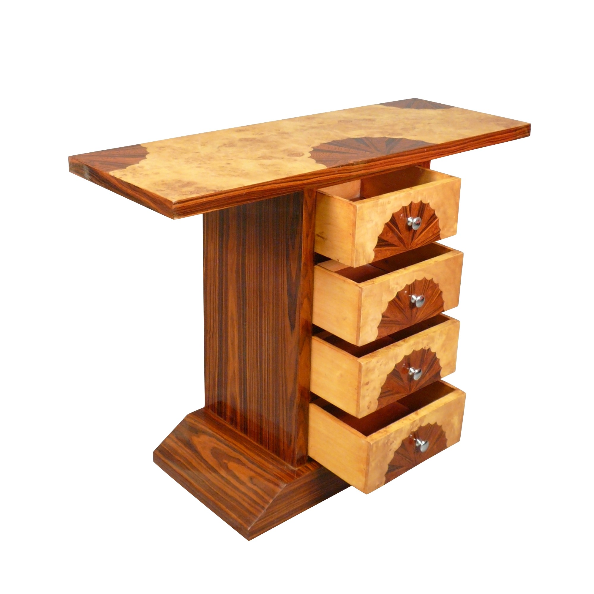 Dans le style 1910, cette console art déco est en bois de hêtre, elle est marquetée de loupe d’orme et de palissandre.