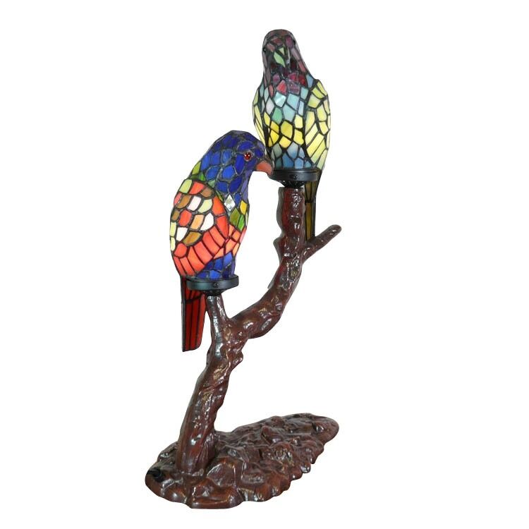 Deux perroquets colorés aux airs exotiques prennent vie sous forme de lampe, perchés côte à côte sur une branche stylisée dans cette création Tiffany pleine de charme. Les abat-jours en verre coloré artisanal, façonnés selon la méthode traditionnelle de Louis Comfort Tiffany, révèlent des teintes vives et des détails minutieux qui évoquent le plumage chatoyant de ces oiseaux tropicaux.