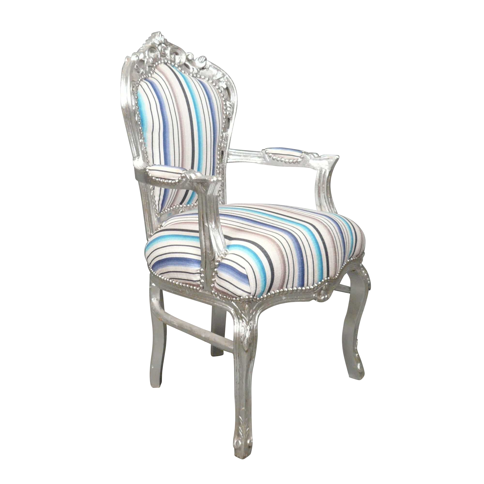 Fauteuil baroque en hêtre massif de couleur argent, tapissé d’un tissu multicolore avec des clous de tapissier.