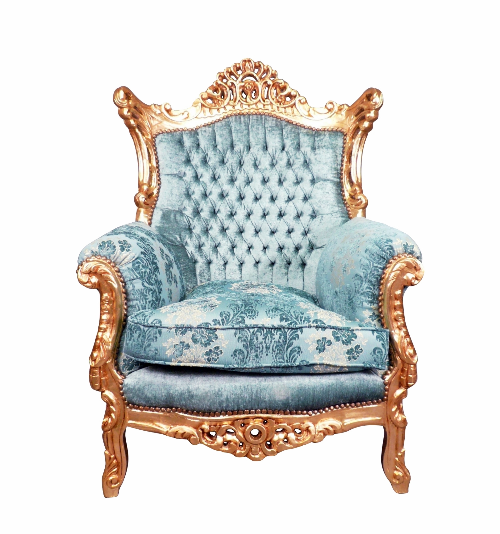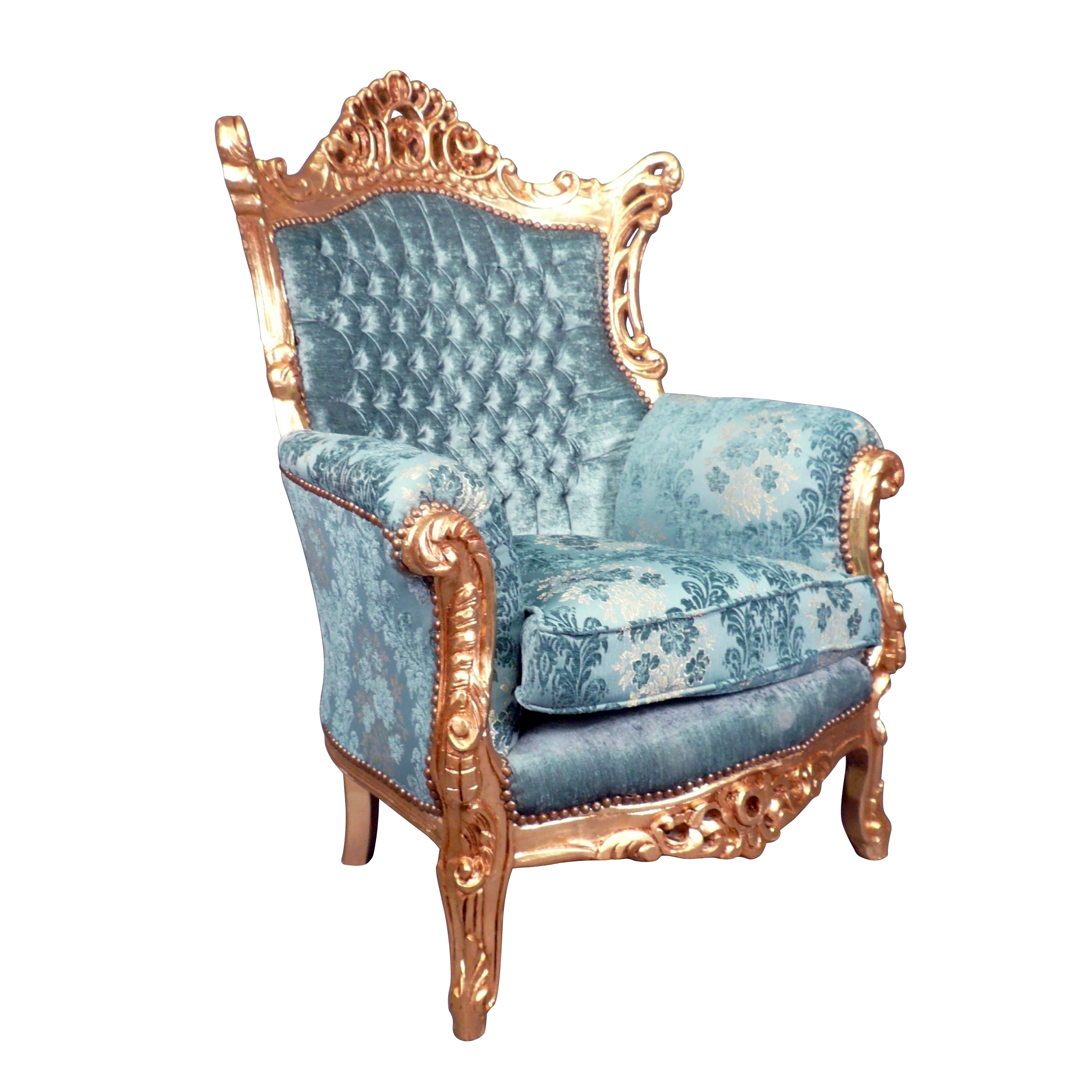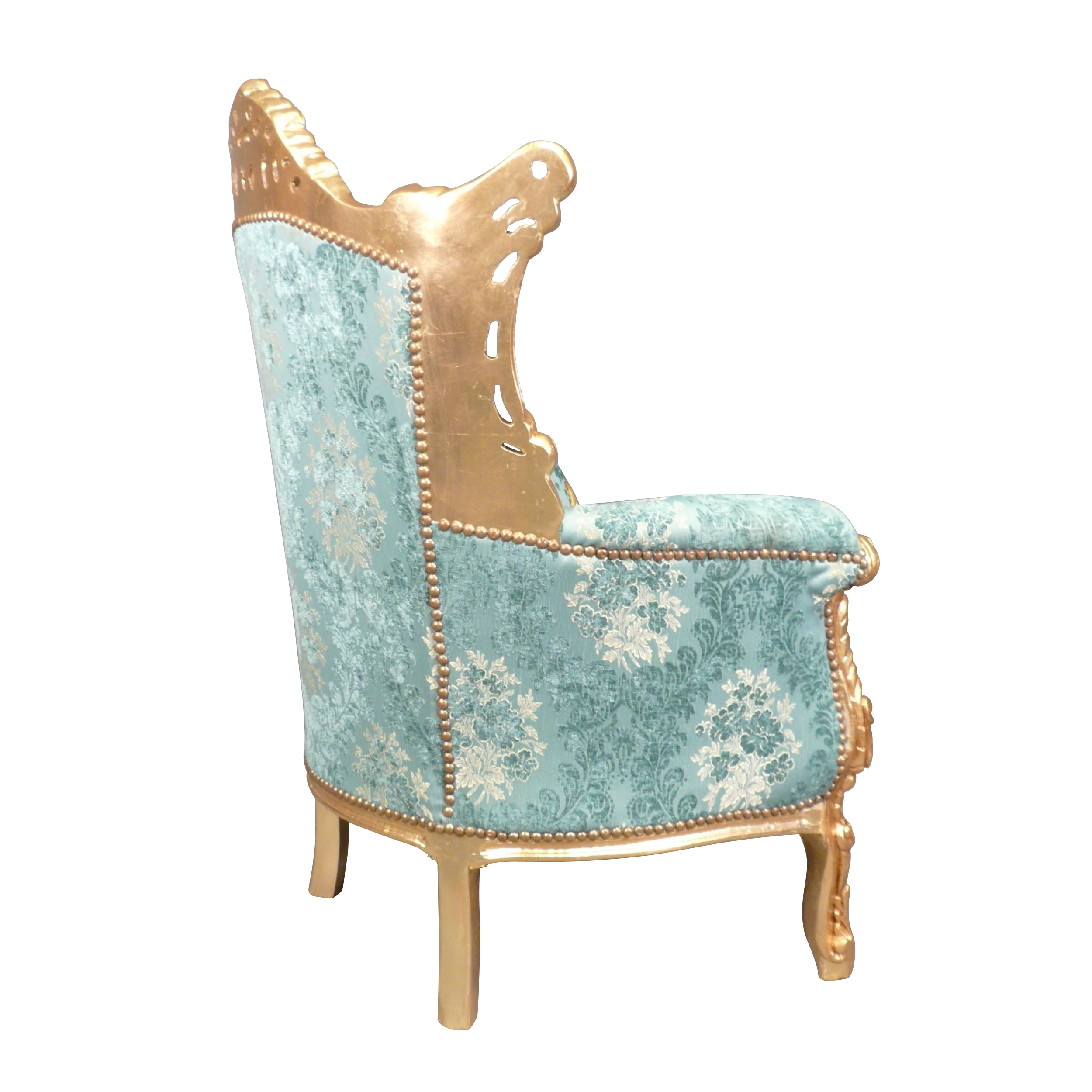 Ce fauteuil baroque Rome est une véritable œuvre d’art, débordant de raffinement et de détails luxueux. Son ossature, faite de bois de hêtre, est une merveille en elle-même. Le bois a été doré, conférant au fauteuil un éclat royal et une impression de grandeur. Ce cadre doré est aussi richement sculpté, illustrant un art de décoration complexe et soigné, typique du style baroque.