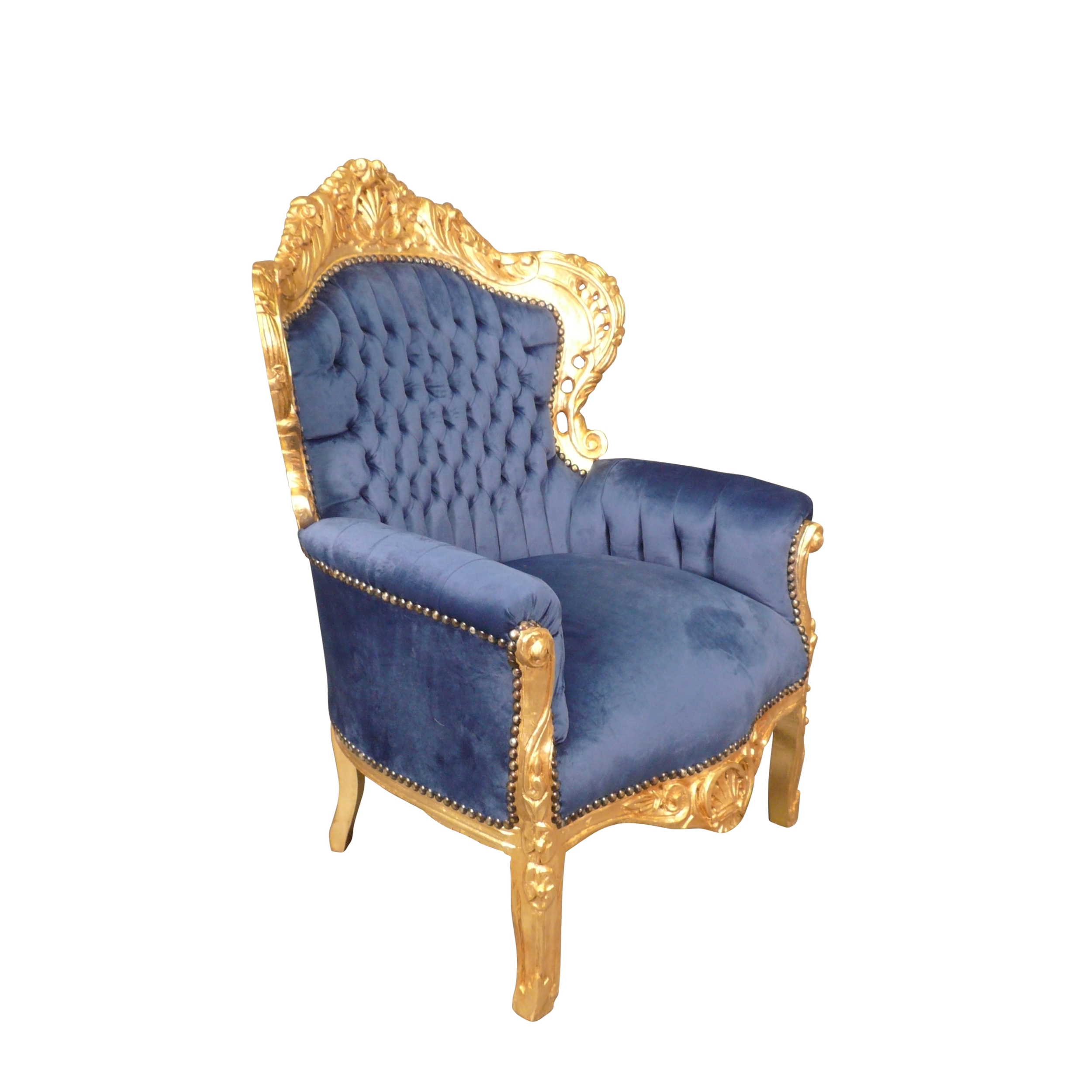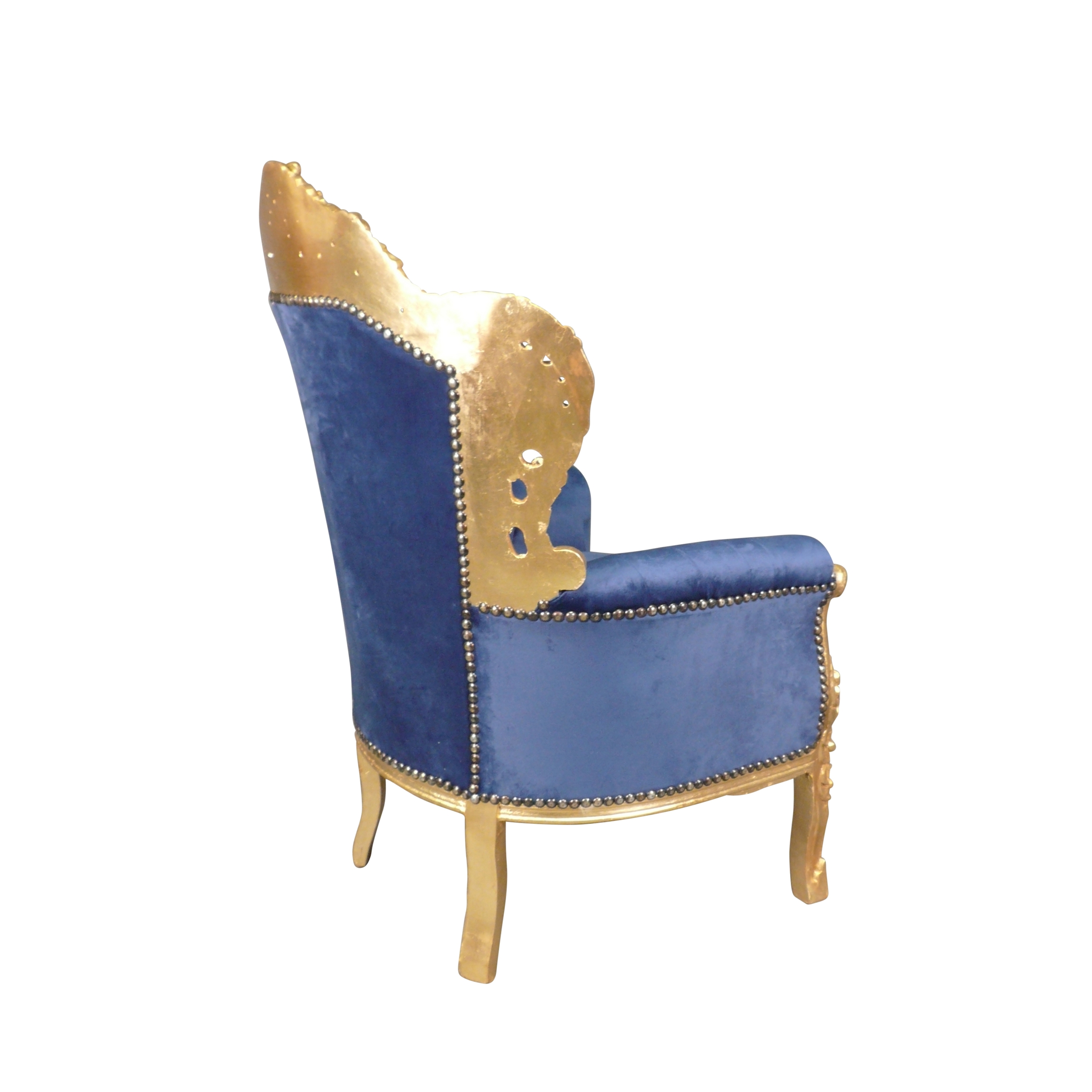 Le fauteuil baroque en velours bleu est fabriqué avec un cadre en bois massif doré, il est tapissé d’un tissu en velours bleu fixé par des clous de tapissier.