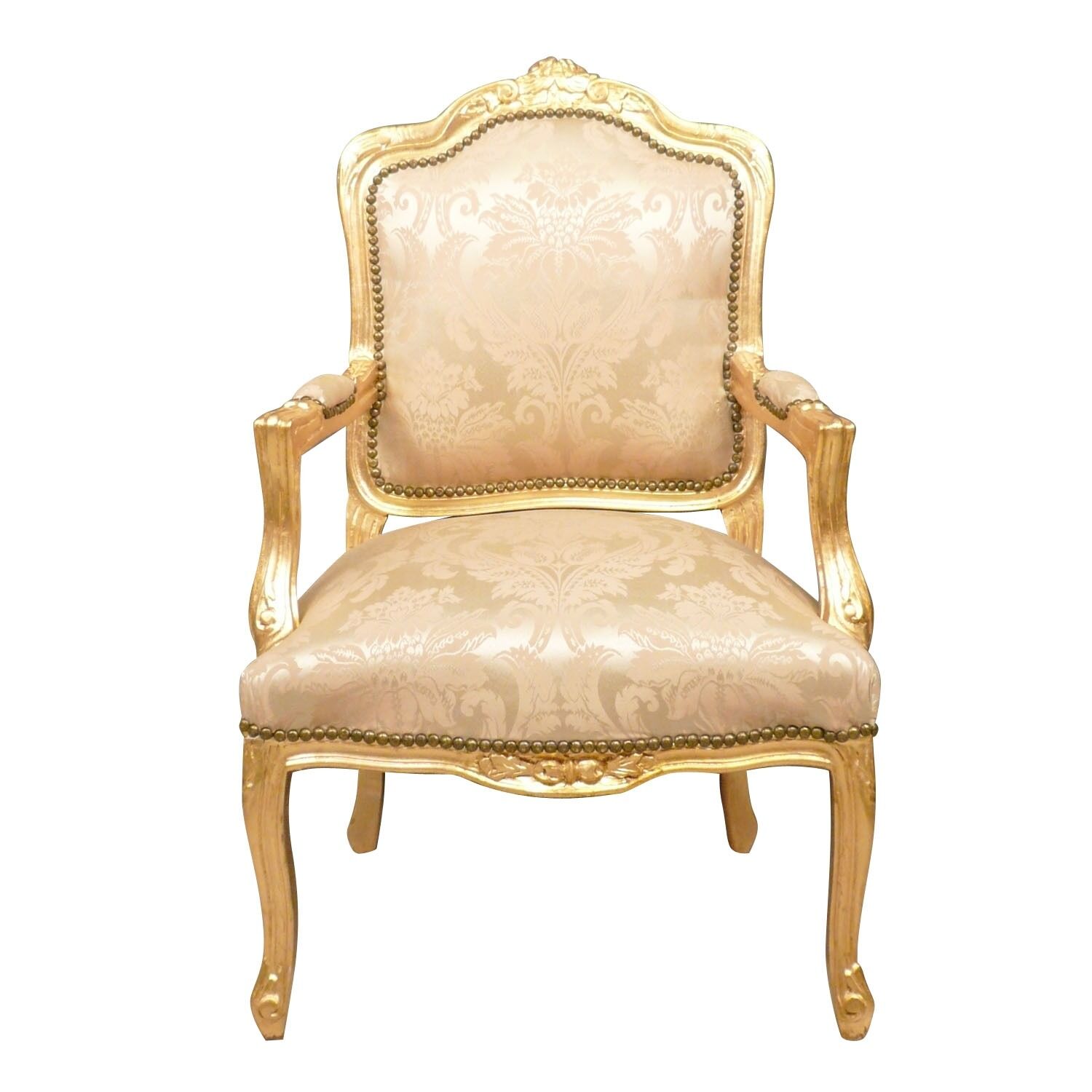 Fauteuil Louis XV en hêtre massif doré avec tissu satiné, sculpture artisanale. Élégance classique pour salon ou chambre de style.