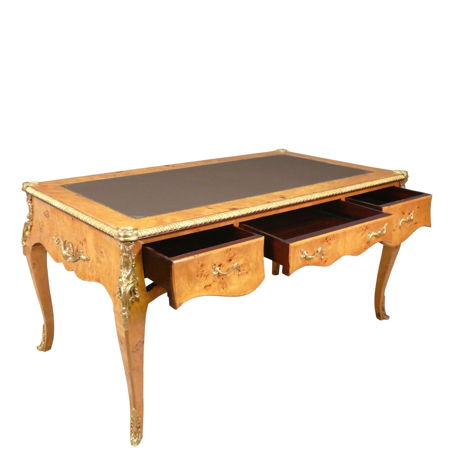 Le contour du plateau est sublimé par une ornementation en bronzes dorés finement ciselés, conférant au meuble une prestance aristocratique. Le centre du plateau est habillé d’un sous-main souple à micro-reliefs, imitant subtilement la texture de la peau. Ce revêtement procure un véritable confort d’écriture et accentue l’esthétique luxueuse de l’ensemble.