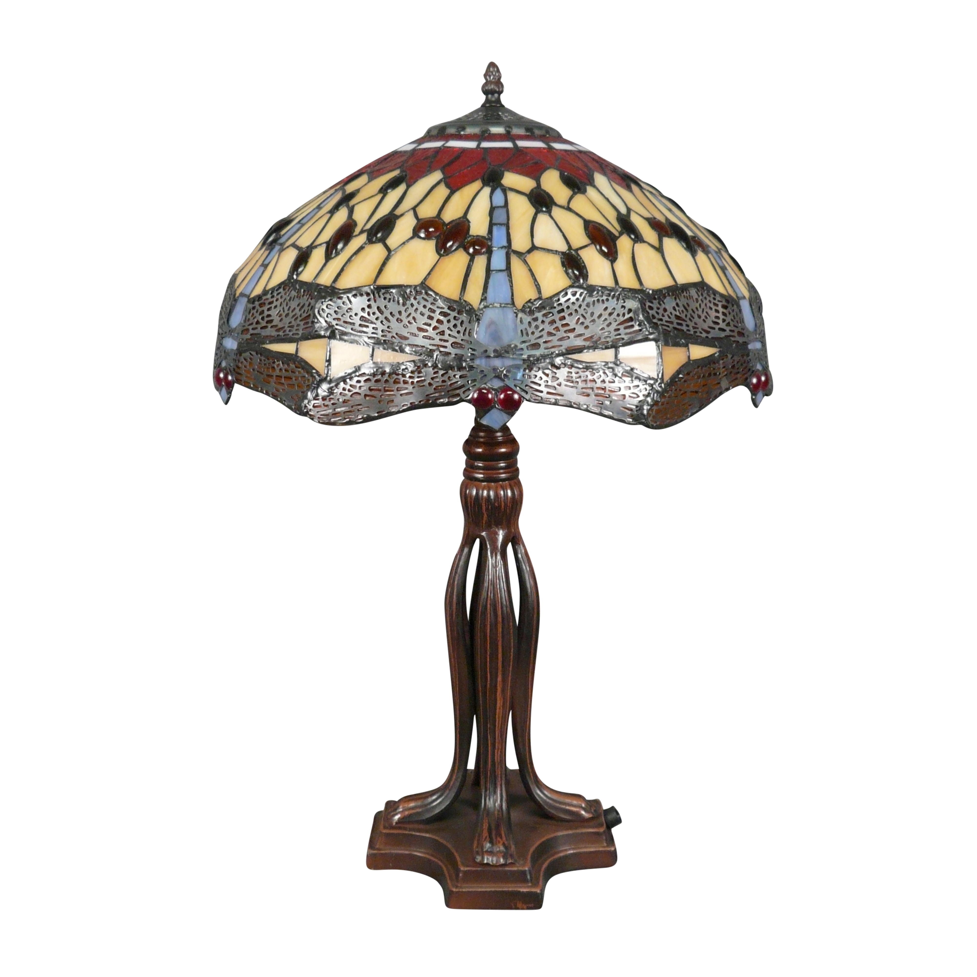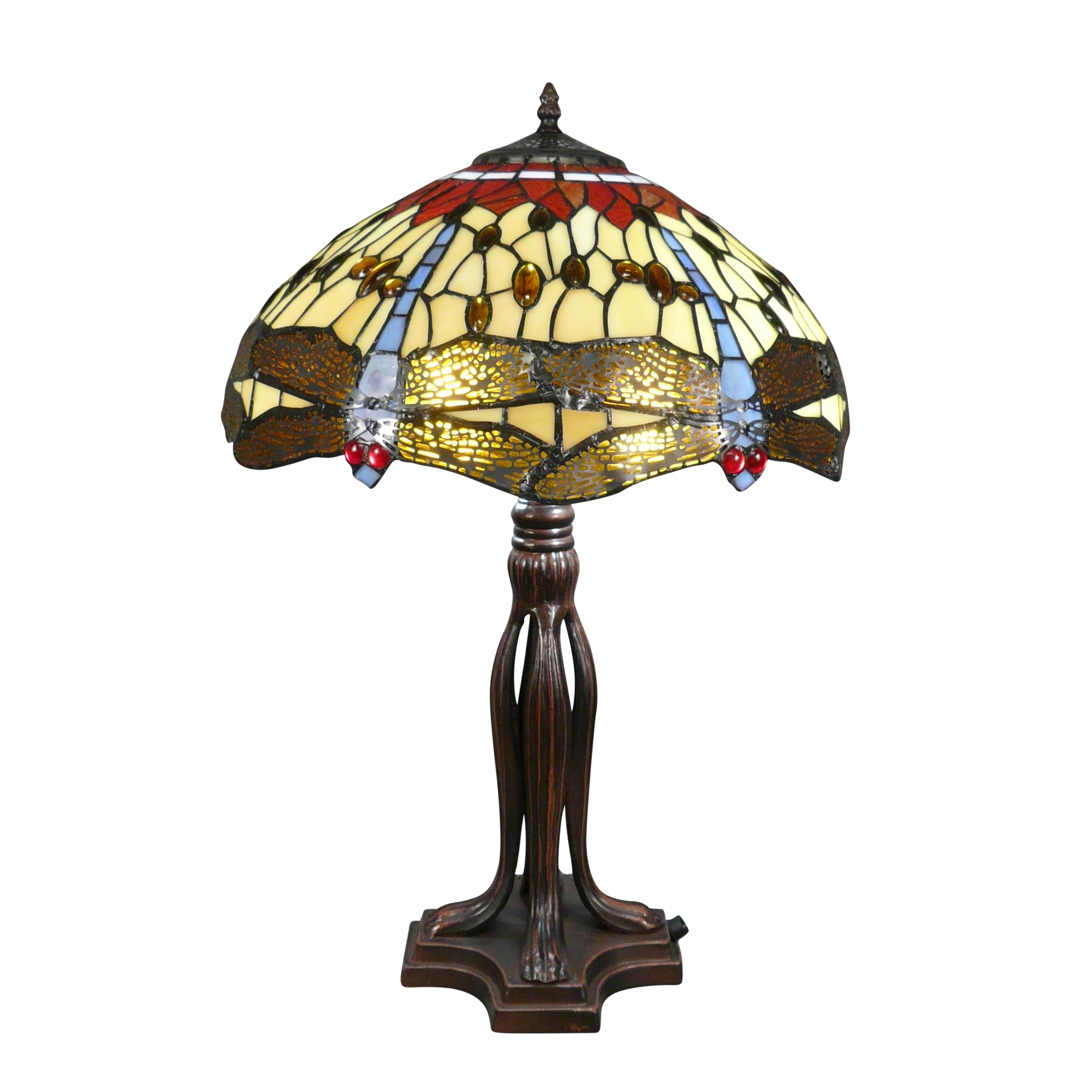 Le vitrail de la lampe Tiffany Dragonfly comporte du verre rouge, jaune – ocre, bordeaux, blanc et bleu