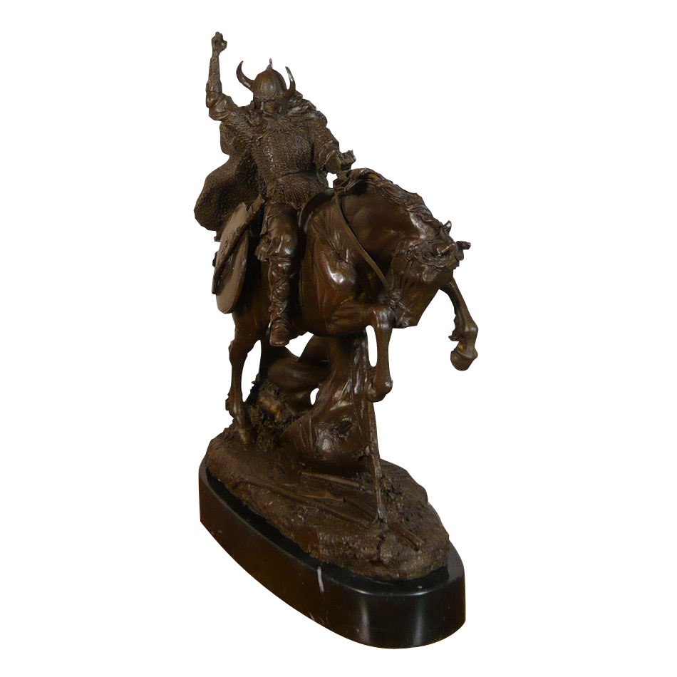 Statue en bronze d’un guerrier viking sur son cheval en pleine bataille.