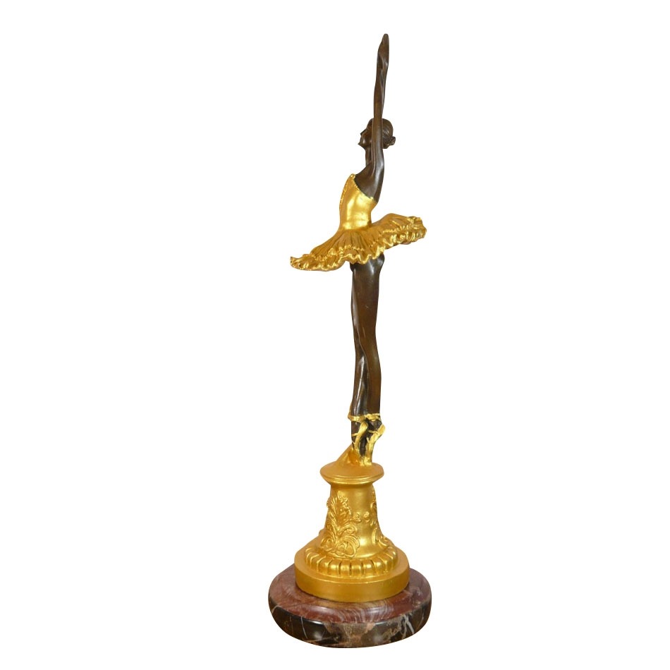 Statue en bronze représentant une danseuse sur les pointes, à la patine brune et dorée.