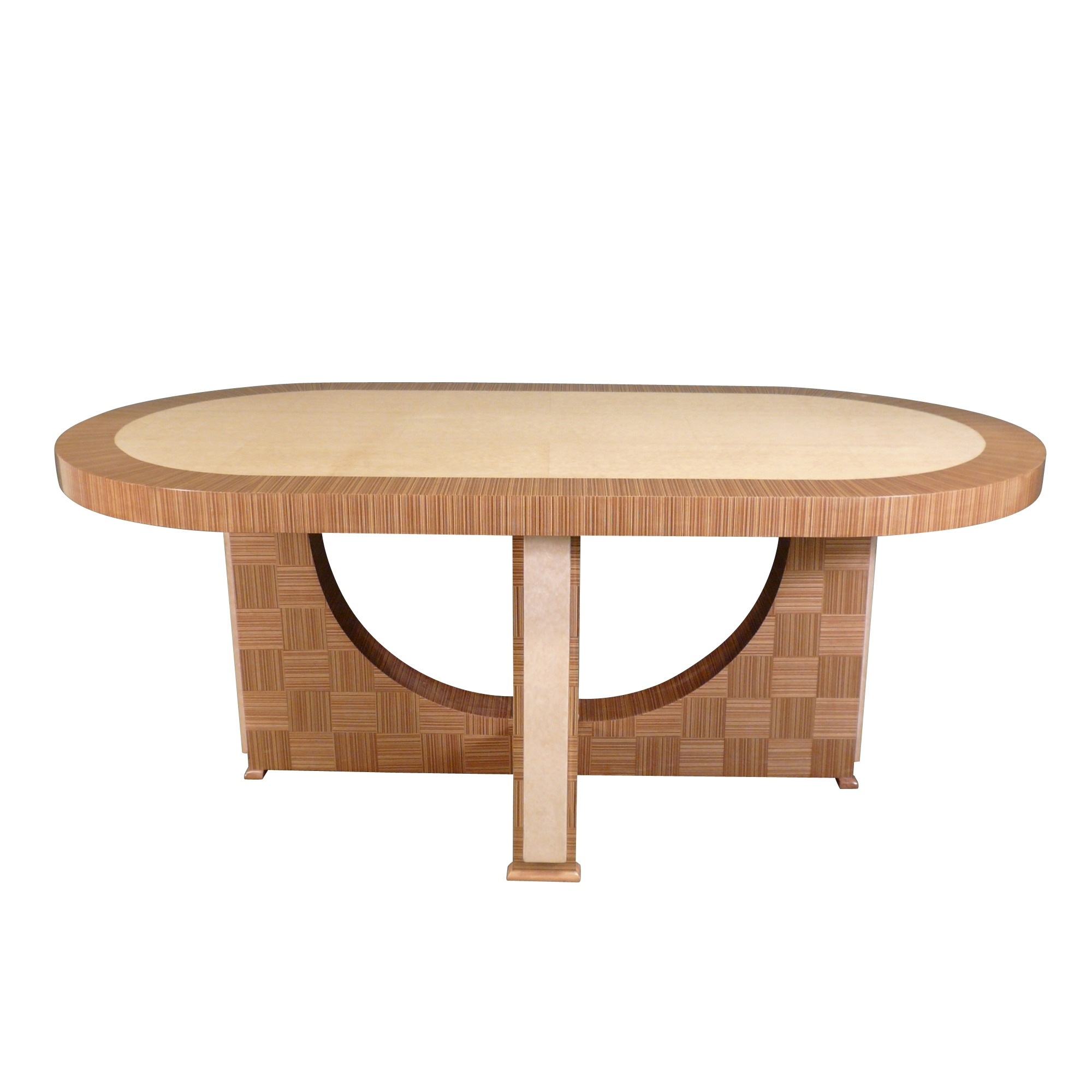 Cette grande table art déco de salle à manger rend hommage aux créations luxueuses des années 1930. Elle se distingue par un placage raffiné de marqueterie « Bird’s eye » – un bois rare aux motifs finement mouchetés – associé à de l’acajou blond aux reflets dorés.