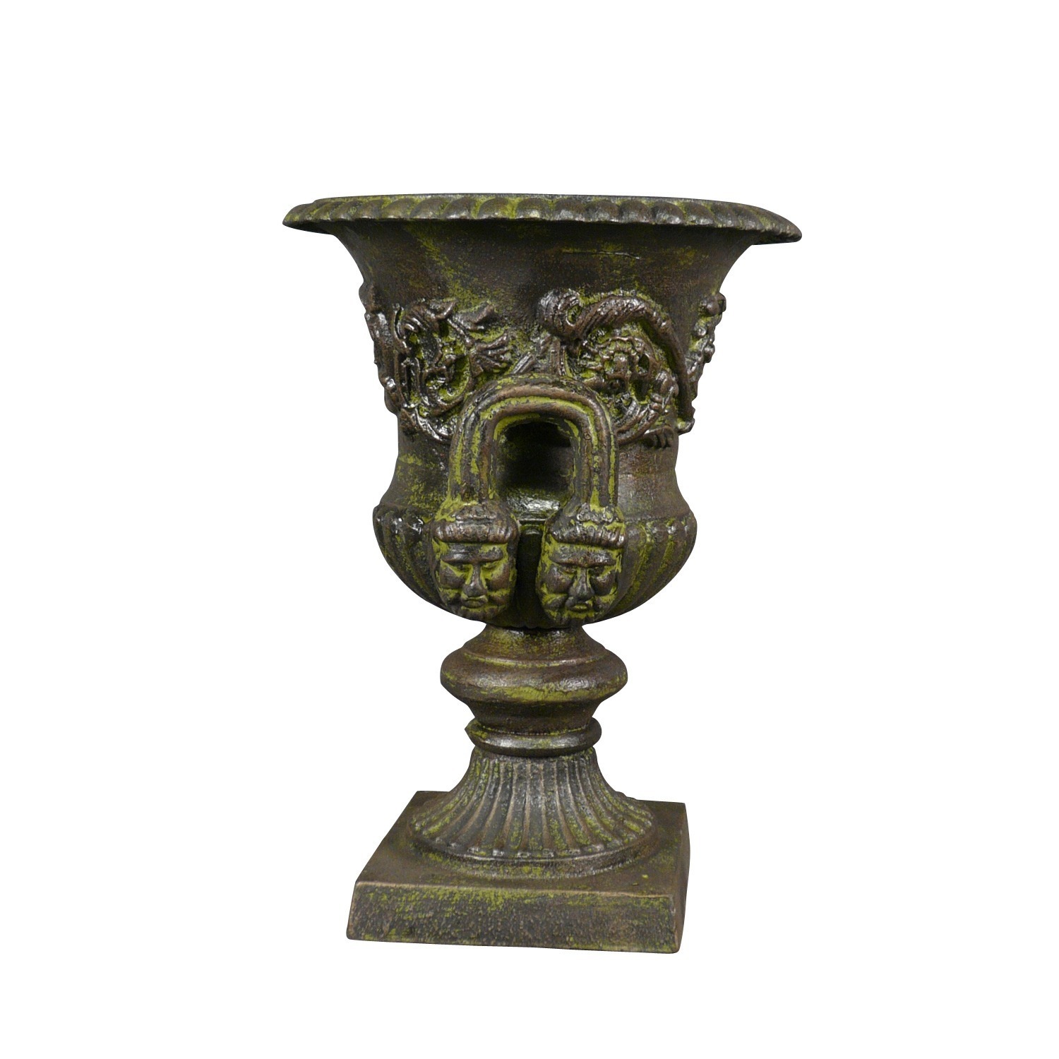 Fabriqué artisanalement en fonte de fer, ce vase bénéficie d’une teinte vert de bronze directement intégrée dans la masse, garantissant une grande durabilité face aux intempéries. Son aspect patiné renforce l’authenticité de son allure inspirée des modèles antiques.